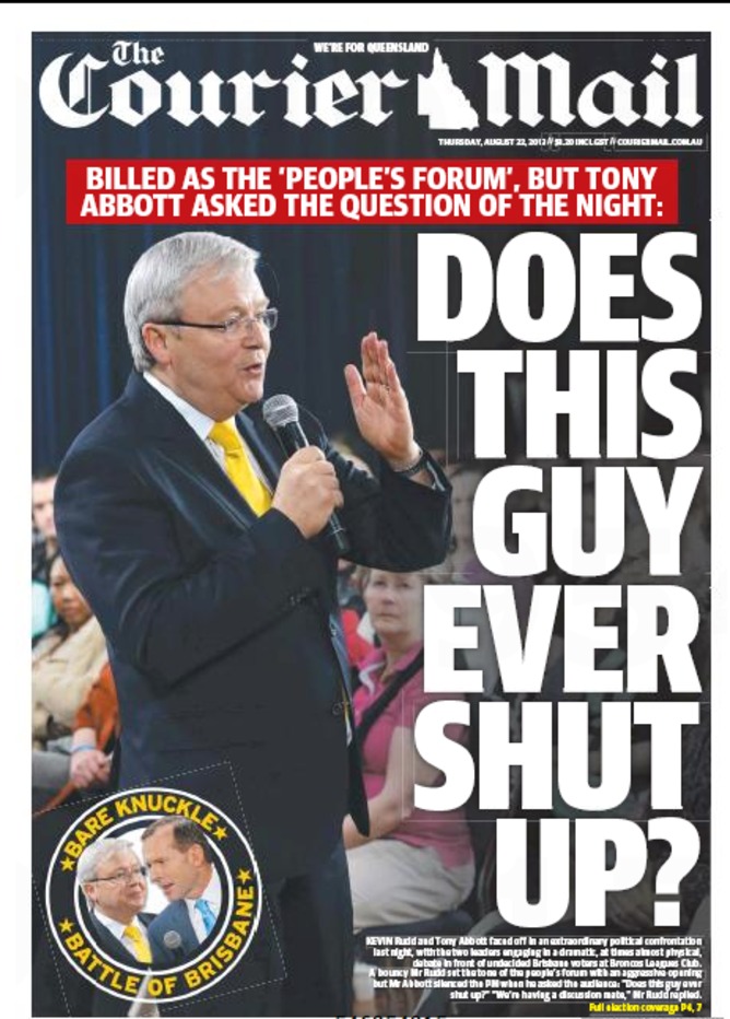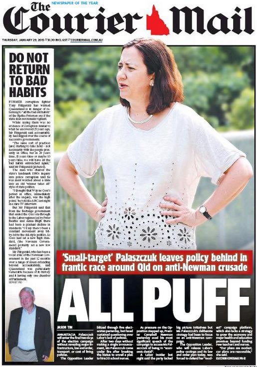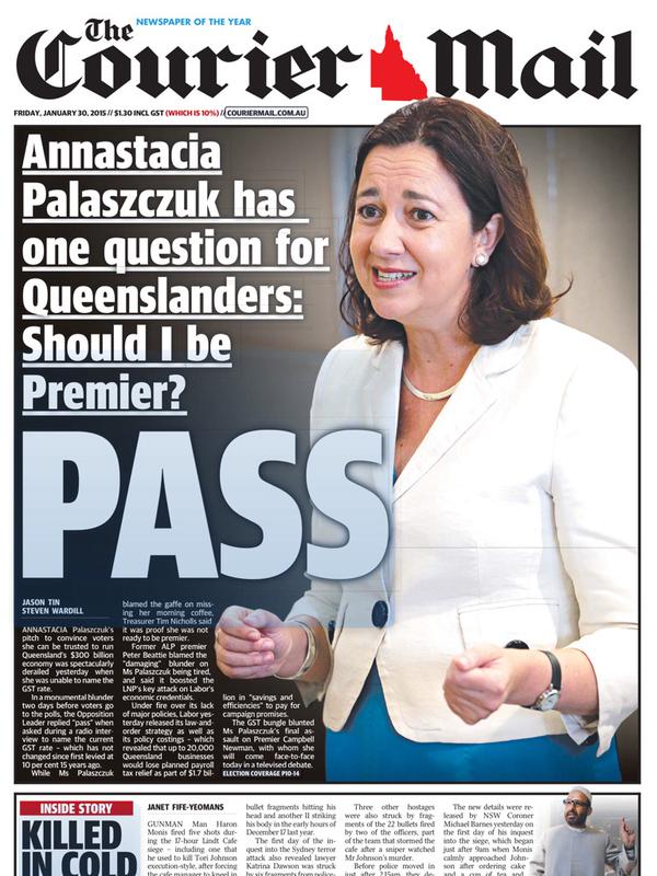 Take Queensland’s most recent election for example. Despite the sitting Premier’s absolutely appalling public image and polling, our News Ltd outlet and sole Queensland based newspaper ran with a charming series of front pages that were about as subtle as a brick to the face, or an erection in tracksuit pants.
